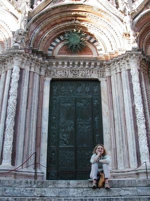 We knew from our tour book that there was a famous duomo in this town, but Siena is a walled city, and it's hard to see what's around you. The main streets (I'm not sure if cars were allowed there) felt very enclosed. So we walked up some steep alleyways and found the extremely ornate duomo you see above.