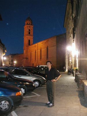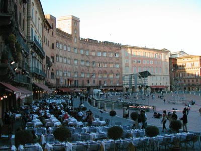 We walked into the piazza of this town, known as the Campo, which is a fan-shaped gathering place for the entire town. See the postcard view below. It is flanked by restaurants and shops. At the bottom people appeared to be setting up or taking down a stage and sound system. As it turned out, the evening of the day we were leaving, the famed Andrea Bocelli was giving a free concert there! On a train a few days later we met an Australian family who was there at the same time and stayed to see the concert.